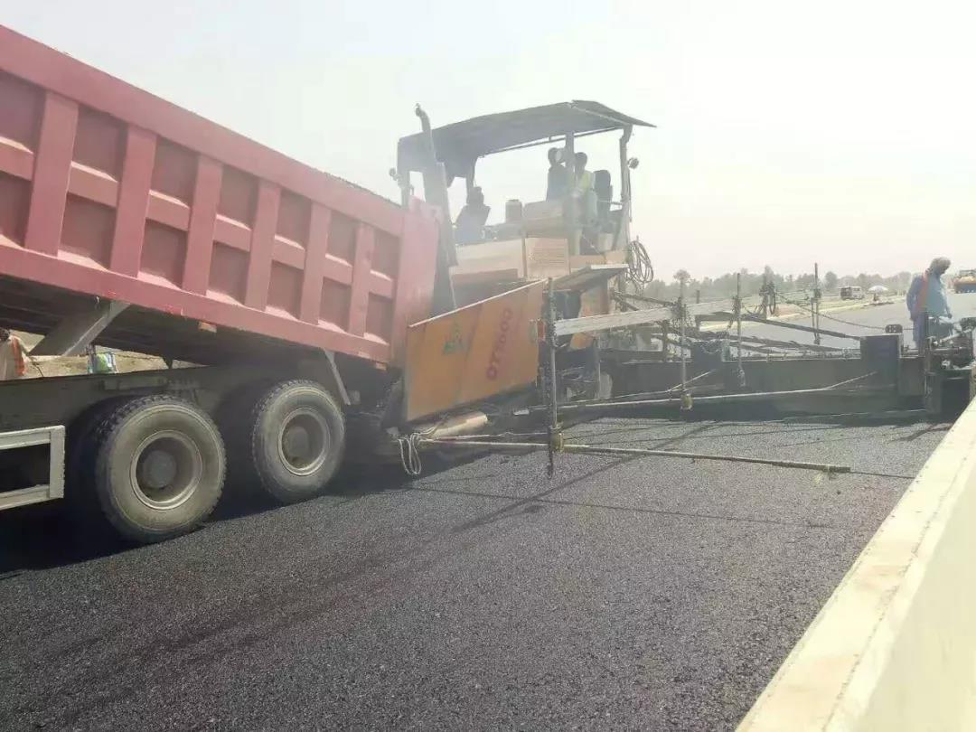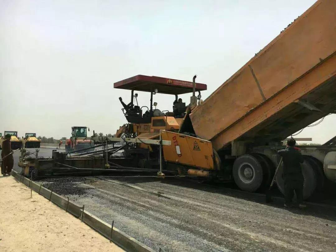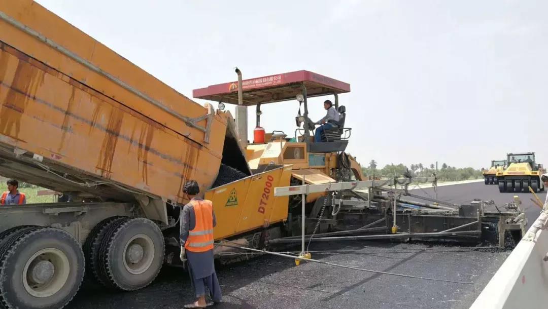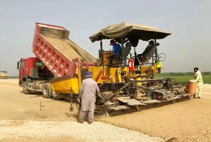 云南陽光道橋購買的中大Power DT2000型攤鋪機在巴基斯坦PKM路面一分部抗離析大寬度攤鋪。